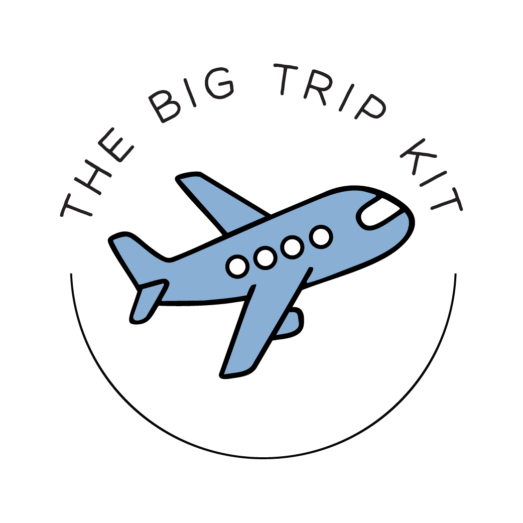 A circular logo with a blue airplane in the center and black text above it that says "The Big Trip Kit".