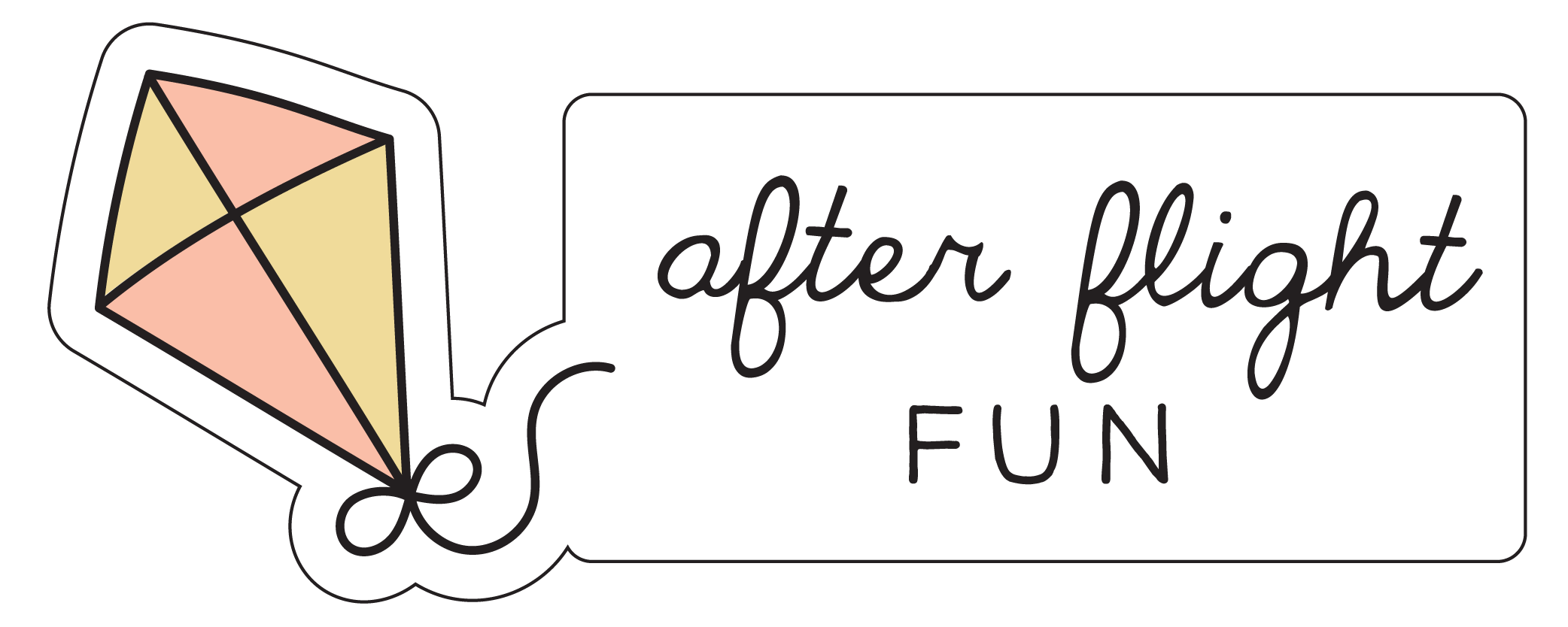 Colorful diamond-shaped kite with a white string and a speech bubble reading 'after flight FUN'