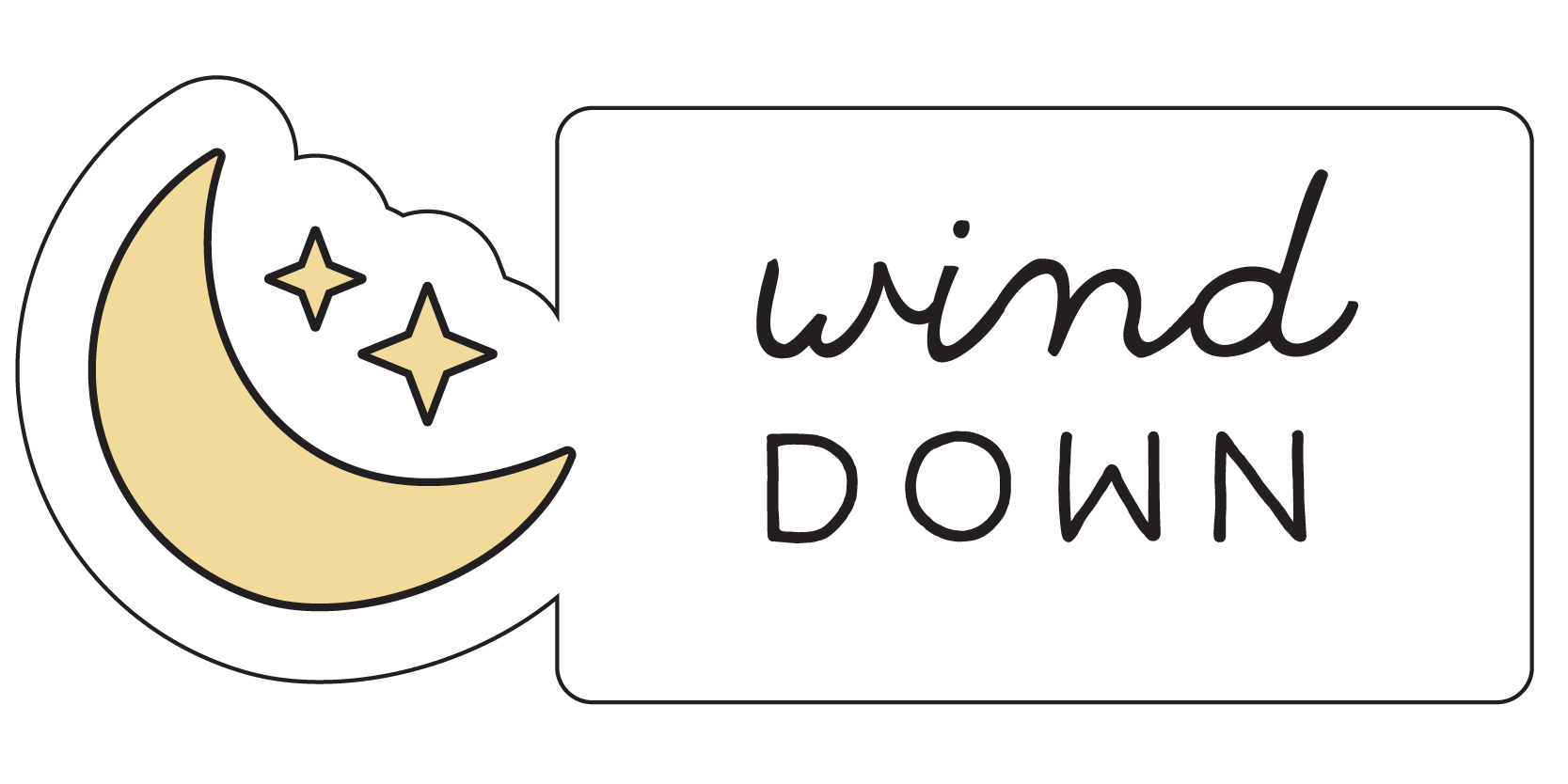 A logo with a moon and stars illustration on the left, and the words 'wind down' in handwritten script on the right, all within a black background.