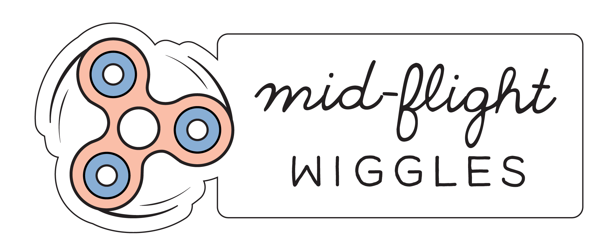 A logo featuring a stylized fidget spinner with three blue circles and pink arms, alongside the text "mid-flight wiggles" in black cursive and print fonts.