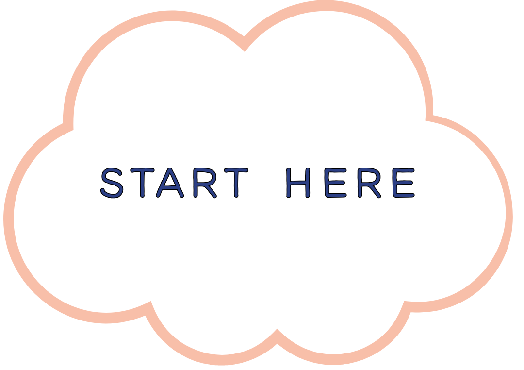 A white cloud-shaped sign with a light pink border and the words "START HERE" written in blue in the center.