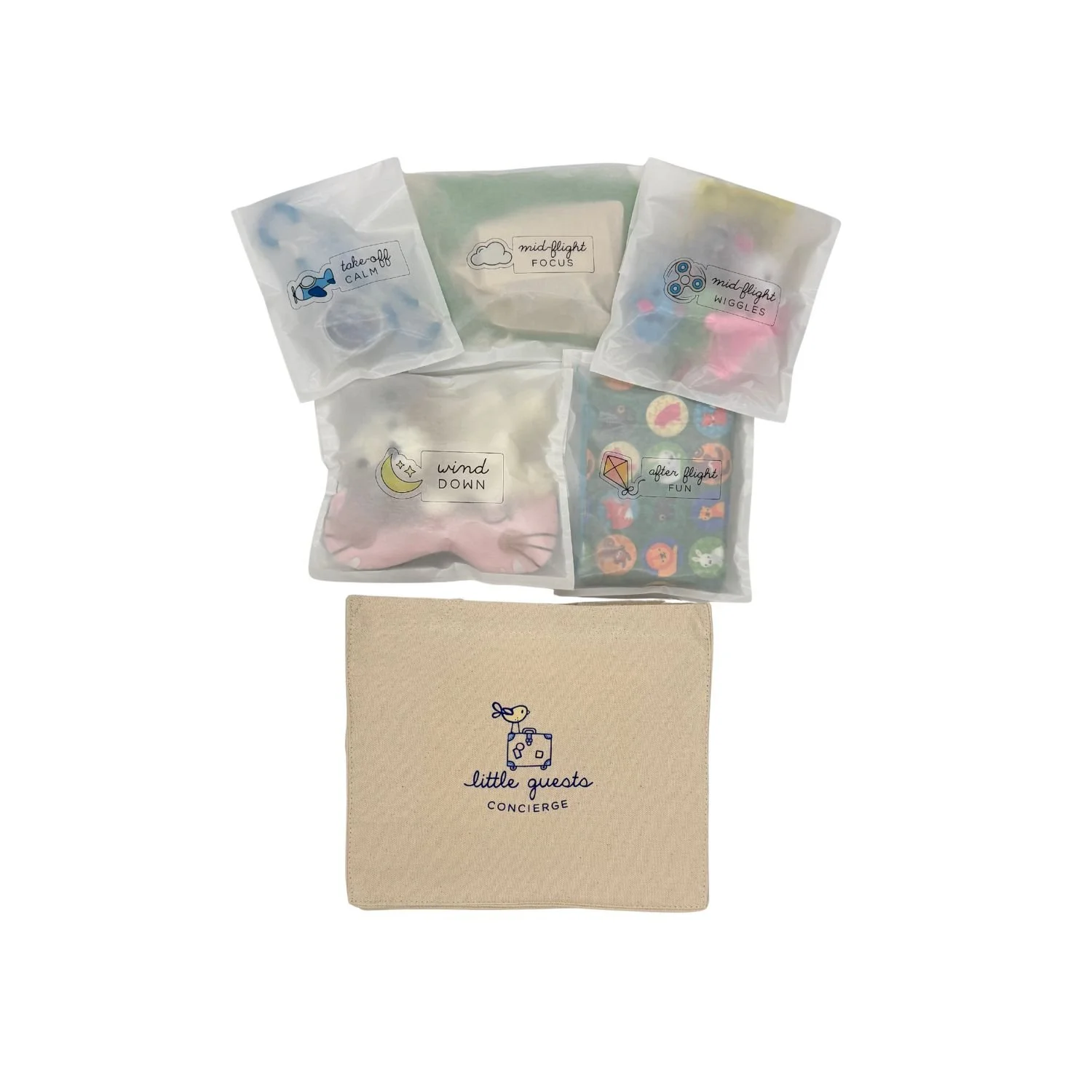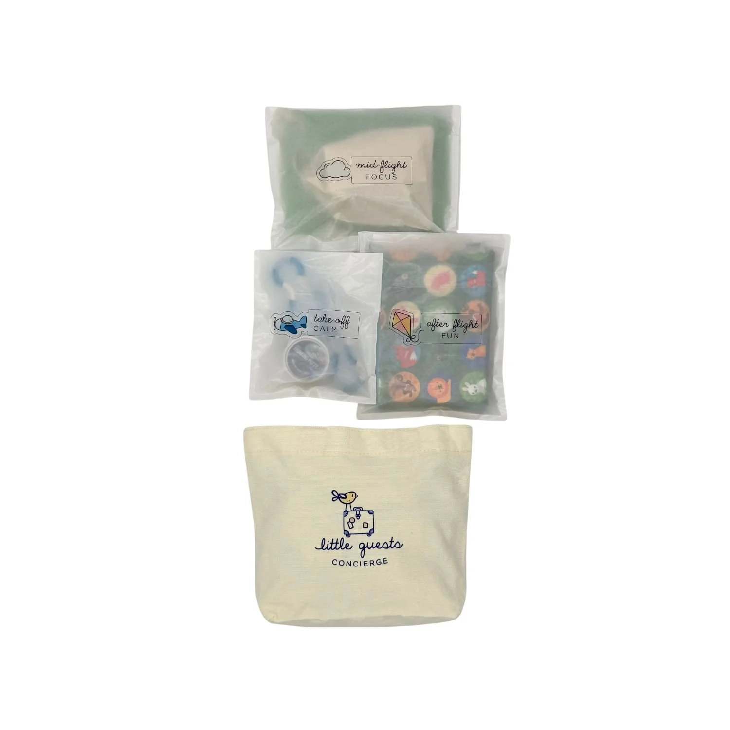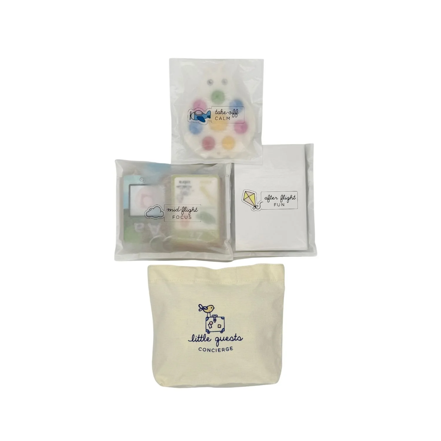 Each kit includes a reusable canvas tote packed with modular Discovery Envelopes tailored to your selected flight length. Open them at different stages of the journey to reduce stress and create calming, connected moments. Exact items may vary based on availability but the experience stays the same: premium, travel-ready activities curated for your child’s age and moment of the journey.