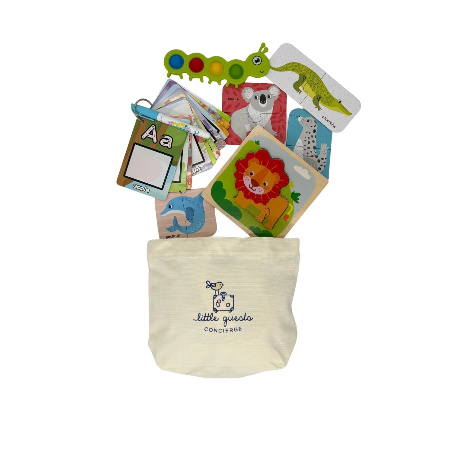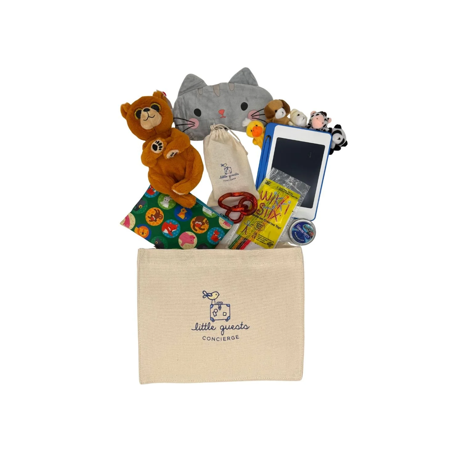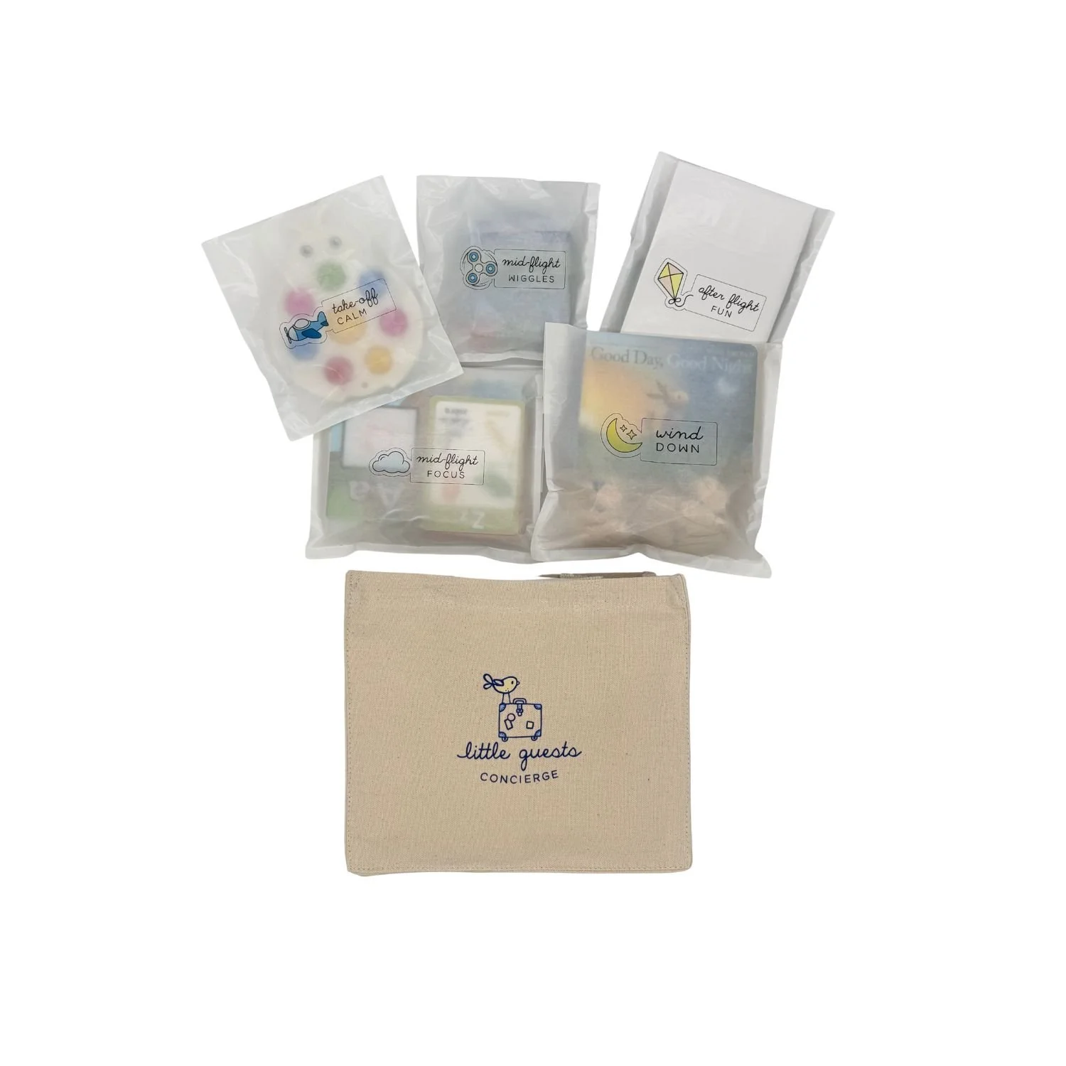 Each kit includes a reusable canvas tote packed with modular Discovery Envelopes tailored to your selected flight length. Open them at different stages of the journey to reduce stress and create calming, connected moments. Exact items may vary based on availability but the experience stays the same: premium, travel-ready activities curated for your child’s age and moment of the journey.
